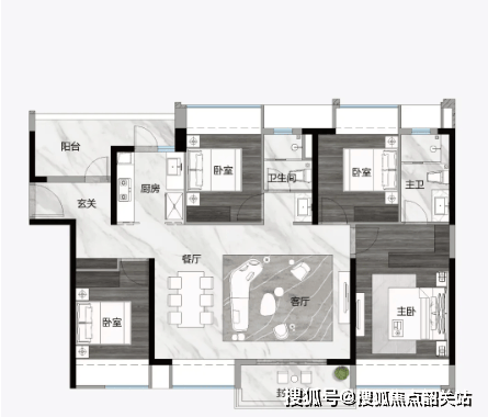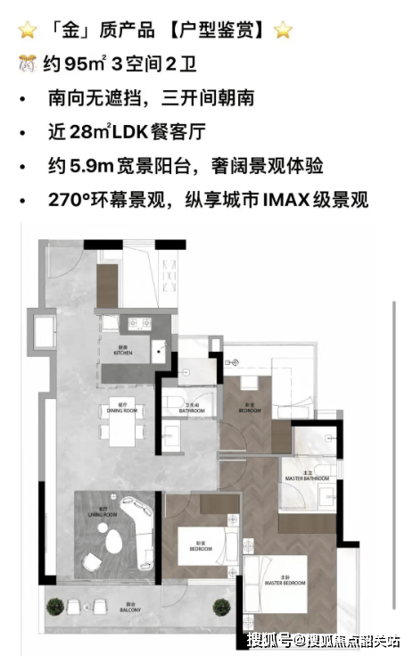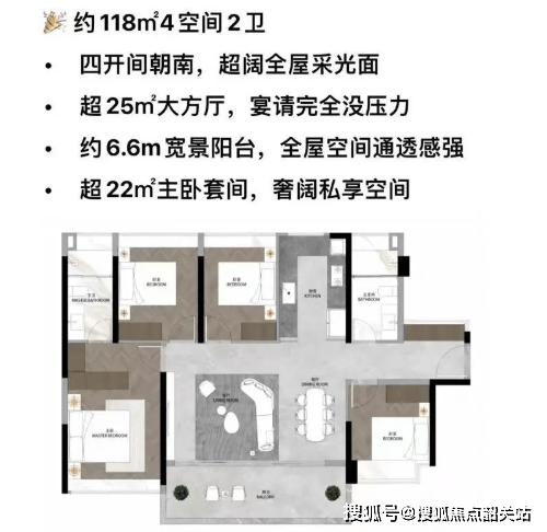 112平方米的3+1房2厅2卫户型,采用两梯四户南向低密度设想,LDKB(客餐厨阳台)一体化设想让空间显得愈加宽阔通透。全屋升级了80cm阔景飘窗,不只添加了室内采光,还供给了更多的休闲空间。